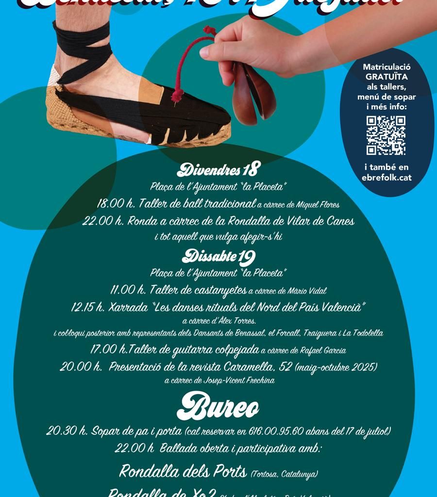 Els dies 18 i 19 de juliol Benassal es convertirà en escenari d’una nova edició de l’Ebrefolk, una trobada que reuneix cultura, música i dansa tradicional en el cor de l’Alt Maestrat. Durant dos jornades, la plaça de l’Ajuntament “la placeta” acollirà un programa variat pensat per a totes les edats, amb propostes formatives i festives que combinen tradició i participació
