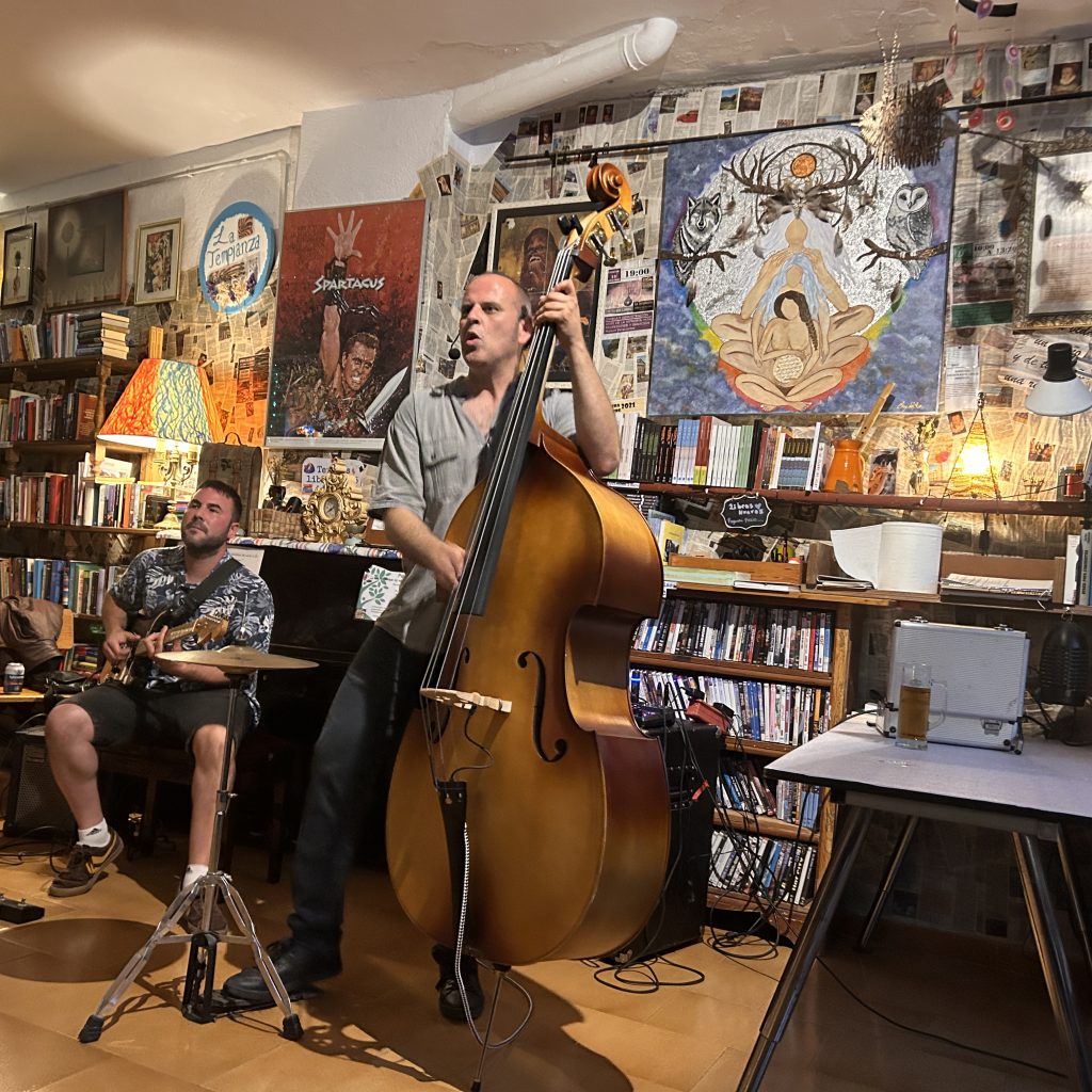 Des del directe, la fusta -gran presència del contrabaix, potent vibració, el duet va oferir una sessió trepidant de rockabilly, blues i ritmes llatins, passada pel sedàs mediterrani. Una reinterpretació emocional de “Fever”, -conversa amb la guitarra-, i Galiana marcant el tempo amb un contrabaix que no sols feia de base rítmica, sinó que respirava amb personalitat pròpia. Versions inesperades d’”Oye cómo va” de Santana, amb un groove llatí fos amb un toc de jazz i swing. El públic —un grup heterogeni de locals, turistes i amants de la música— es va deixar endur sense resistència. Els primers acords de “La Bamba” convertida en jump blues, amb ecos de Nueva Orleans, i una versió de “Hace calor” de Radio Futura, per exemple, van esdevenir covers despullats i sense artificis que van arrossegar el públic pel so elèctric amb aires de frontera, convertint-los en viatgers entre influències musicals i culturals sense cap ni una resistència, una implicació bidireccional entre públic i músics que va aconseguir signar una nit de mestissatge sonor.