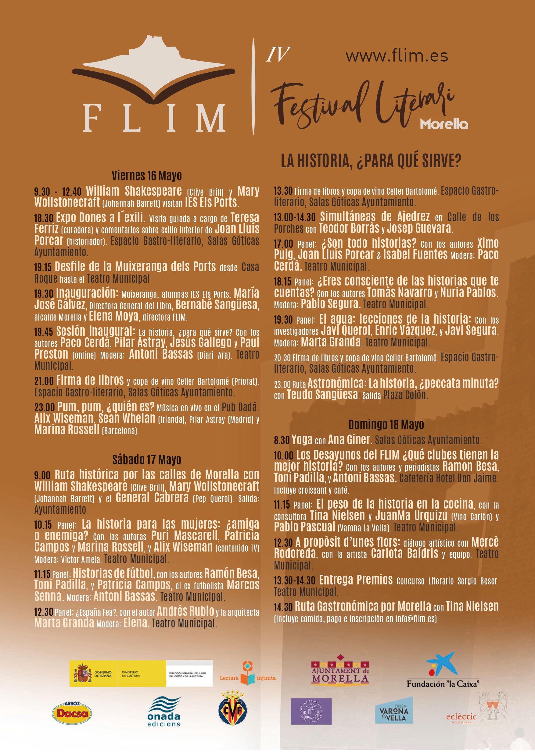 Música en viu; rutes astronòmiques-s’apagaran les llums del Castell per gaudir d’un cel estrellat “com sols es pot contemplar als pobles”; gastronomia -amb presència en undels panells de Juanma Urquizu, de Vi Carlón- ; ioga; Històries de futbol; els Desdejunis de FLIM o el panell ‘La Història per a les dones, amiga o enemiga?’ a càrrec de Puri Mascarell enriquidores, “tant per a la gent que assisteix com per a nosaltres”. “Volem que la gent de diferents àmbits es barrege, que el festival siga un punt de trobada, que la cultura i la literatura siga una eina d’apropament i que ens connecte amb la vida”.  Moya fa una crida a la participació i a gaudir del Festival: “no volem els vostres ‘likes’, volem que vingueu”. A la pregunta com em convidaria a participar contesta: “És el millor que puc fer per tu, un cap de setmana de plaer intel·lectual, un intercanvi de cap i cor. No tinc res millor que donar-te”