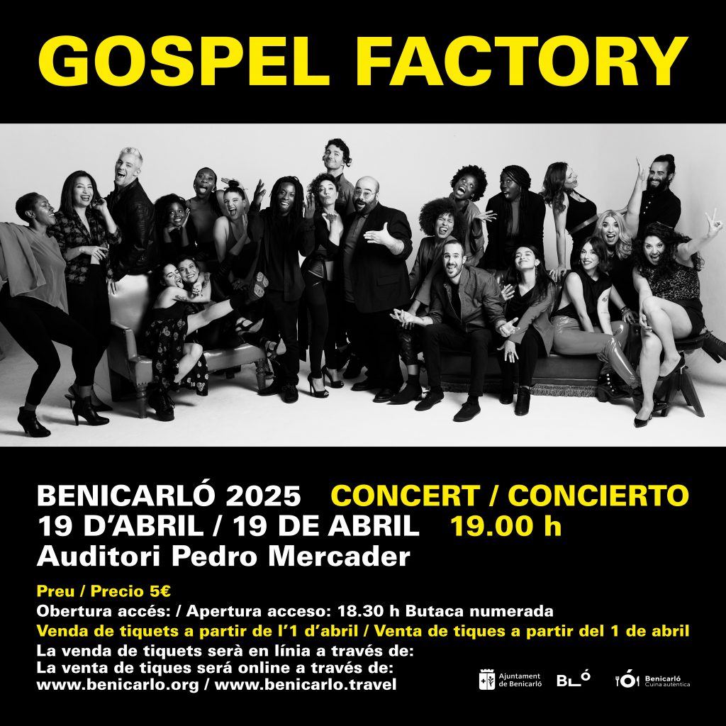 Benicarló acogerá una propuesta musical de primer nivel: el concierto de Gospel Factory, uno de los coros de gospel más prestigiosos de Europa, formado por cantantes de más de 20 países. La actuación tendrá lugar el próximo 19 de abril a las 19.00 horas en el Auditorio Pedro Mercader, con entradas a un precio simbólico de 5 euros.